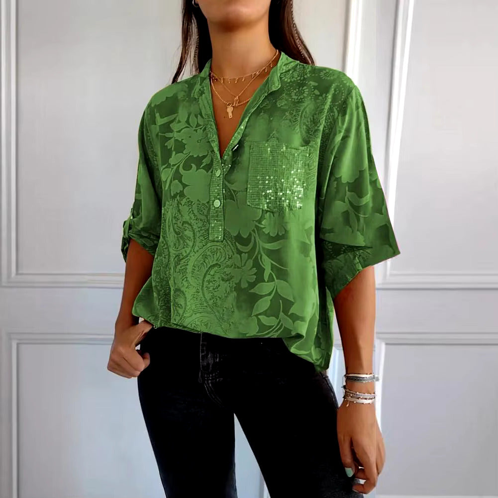 Step into a world of effortless style with our Sienna Floral Pattern Shimmer Pocket Top. This stunning top offers a perfect blend of sophistication and comfort, making it a must-have in your wardrobe.